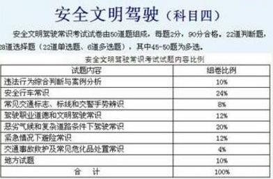 科目四考试试卷由50题组成,总分100分,90分合格,平均每题2分。考核科目四的主要目的是通过学员对科目四安全文明驾驶知识的学习,使每位学员具备对车辆综合控制能力;了解行人、非机动车的动态特点及险情的预测和分析方法;熟练掌握一般道路和夜间驾驶方法,能够根据不同的道路交通状况安全驾驶;形成自觉遵守交通法规、有效处置随机交通状况、无意识合理操纵车辆的能力。