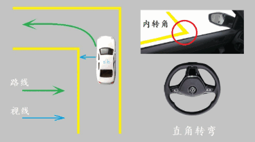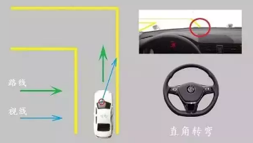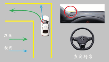 ②或者,当肩膀接近内转角(距内转角1米左右)时,往左把方向盘打到底。观察左前门的三角窗立柱与内转角的位置关系。