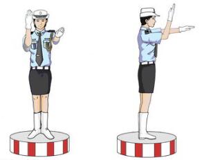 答题技巧:交警举手朝向您,无其它动作时就是告诉您停止,注意,是直抬左臂。