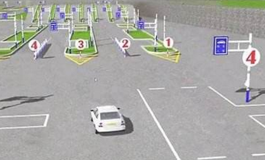 3.“开始考试,请起步”,然后继续前行,当车头进入倒车入库右感应线时,语音播报:“倒车入库”紧接着观察到右感应线对齐驾驶座位时停车。