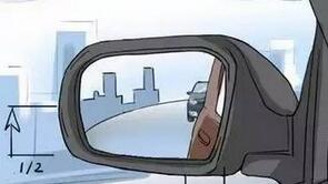 三:右侧后视镜调整要领:把水平线置于后视镜的2/3位置,然后再把车身的边缘调到占据镜面影像的1/4。
