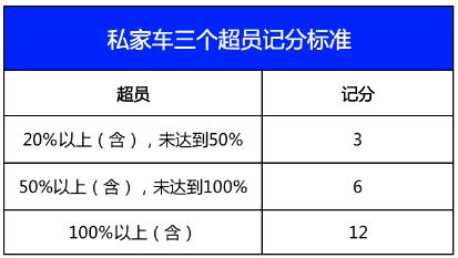 私家车超员有3个等级,三个等级对应的扣分标准具体为: