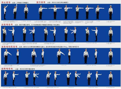 一、八种交通警察手势信号:
