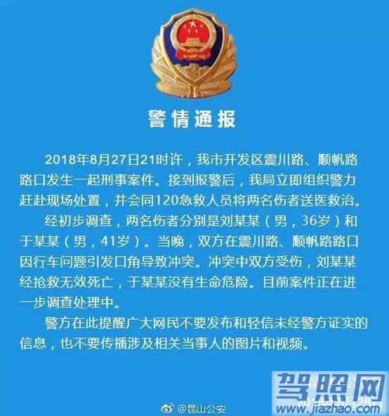 8月28日,网上流传一段视频,视频显示在江苏省昆山市某路口,一辆轿车准备在路口违规占用非机动车道右转时,与一辆经过的电动车因行车问题发生争执,随后双方发生肢体冲突,驾轿车男子回到车上取出一把砍刀,冲突中刀具被电动车主拿到,转身连砍驾轿车男子数刀。从昆山公安的警情通报中可以了解到,驾驶机动车男子刘某某已于案发当日晚经抢救无效死亡,案件正在进一步调查审理中