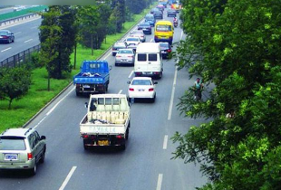 在车流密集的路段,近距离跟着大型车辆行驶,驾驶者要注意到两侧横向道路。