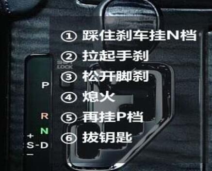 拔钥匙——长时间停车,熄火后,挡位置于P挡,才能拔下钥匙,其他挡位都不能拔下钥匙;N挡时,汽车可以移动。