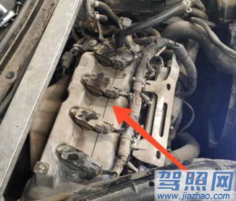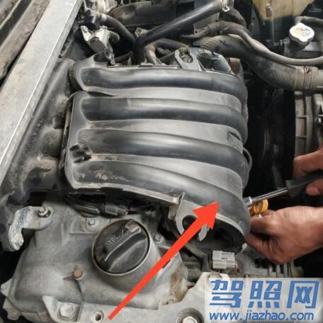 下图箭头所示,师傅正在拆卸发动机上部的进气歧管,它挡着另外三个点火线圈,必须先把它给拆下才行,这就比百分之九十的发动机麻烦。