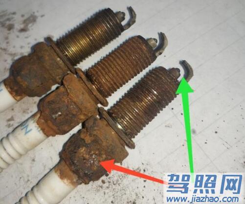 听了师傅的介绍,小编和另一个师傅算是知道了原因,这肯定就要换新火花塞。下图绿色箭头所示,这是四个新火花塞;橙色箭头所示,这是四个旧火花塞,差距非常大。