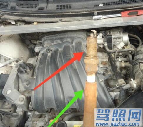 师傅分析发动机失火最可能的原因是火花塞或点火线圈有问题,师傅决定先检查火花塞。没想到的是,师傅看到拆下来的点火线圈和火花塞后,真是惊呆了!如下图绿色箭头所示,黑色的点火线圈已经变成褐色;红色箭头所示的火花塞,也已经变成了褐色!