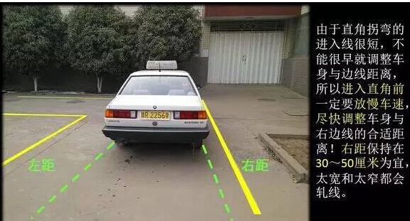 3、注意要调整右后视镜位置,尽量压低,能侧身看到右后胎为好;车子即将进入直角弯时尽量放慢速度;左雨刷器支点贴着直角弯左线前行,这个点根据每个人的位置、身材不同,会有差异,主要是为了保证左轮胎与直角弯左线的距离在15~20公分,并且保证车身正。