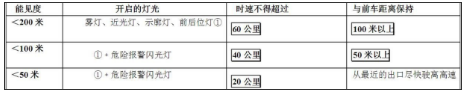 9、 在高速路上行驶,遇有雾、雨、雪、沙尘、冰雹等低能度时,应遵守以下表中的规定: