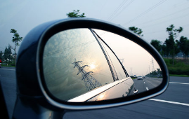 驾驶位在左侧,所以司机对车身右侧的情况较难掌握,因此,右侧后视镜在调整上、下位置时,地面面积应占镜面的2/3,能看到后轮的轮眉(车轮上部),而左、右位置则调整至车身占据镜面的1/4。