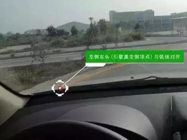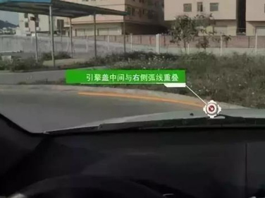 当引擎盖中间和右侧的弧线重叠时,开始向左打一圈方向;