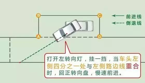 1、打左转向灯,踩离合挂1档,松手刹,当车头左侧四分之一处与左侧边线重合时,回正方向盘,慢速前进(车的位置如图所示)。