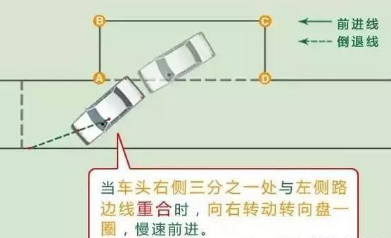 1.看右后视镜,可以看到A点库角,这时停车准备倒车。
