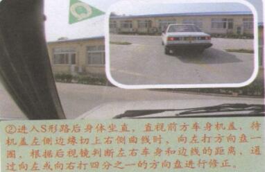 2、进入S形路后身体坐直,直视前方车身机盖,待机盖左侧边缘切上右侧曲线时,向左打方向盘一圈,根据后视镜判断左右车身和边线的距离,通过向左或向右打四分之一的方向盘进行修正。