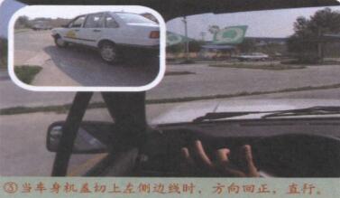 3、当车身机盖切上左侧边线时,方向回正,直行。