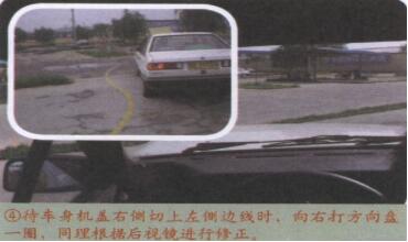 4、待车身机盖右侧切上左侧边线时,向右打方向盘一圈,同理根据后视镜进行修正。