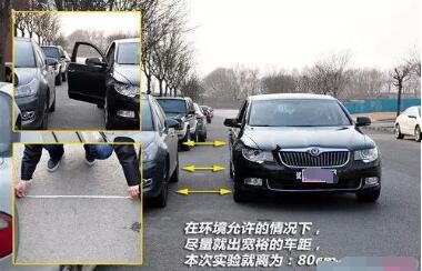 我们模拟一些道路比较狭窄的环境,将车停在离旁车较近的位置,此时右侧车门将将可以打开,经过测量两车车相距在80厘米左右,如果算上后视镜,车距不足半米。