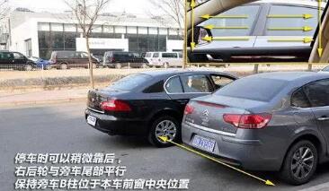 为了倒车时车头更顺利的摆入车位,车辆应当比右侧车辆停放更加靠后一些作为起始位置,至于停在什么位置比较合适,大家可以参考用右后轮与右侧车辆尾部平行,或是右侧车辆B柱保持着本车右前窗中央位置即可。