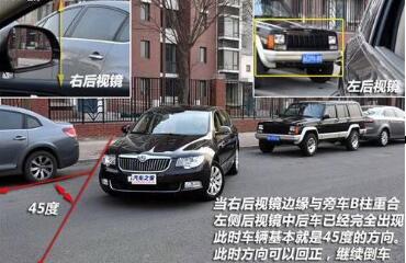找到了合适的起始位置,我们就可以开始倒车了,此时将方向向右侧打满,(为了更好地保护转向系统,建议在打满后向相反方向回一点。并且尽量再缓慢移动中打轮,原地打轮对于车辆有一定损害,实际操作中应当尽量避免)并且开始缓慢倒车,当车头与旁车成45度角时将方向回正。往往作为驾驶员很难从车内视角中判断出是否达到45度,这里介绍一个小技巧,当你观察右侧后视镜的外侧与旁车B柱即将重叠,从左侧后视镜可以看见完整的后车,此时基本处于45度的车辆状态,方向可以回正了。