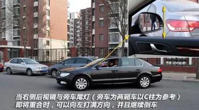 回正方向后一定不要着急反打,此时车尾还没有进入车位中,需要正直方向继续倒车,当左侧反光镜中观察左后车轮即将与后车左侧在一条直线上,或是右侧后视镜外侧与右前车的左后尾灯即将在一条线上时,车辆可以停止后退并且向左侧打满。