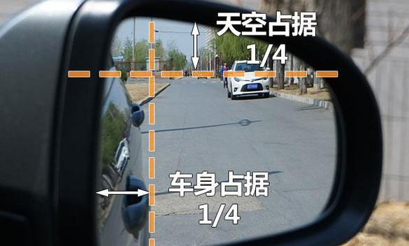 第二步——调右后视镜。以地平线为基准,将后视镜调节至地面占据整个地面的三分之二处,同时保证车身身的边缘只占据整个镜面的四分之一就可以了。右侧后视镜相比于左侧调试难度稍高,学员们可以多试几次。