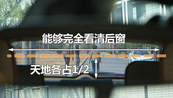 第三步——调车内的后视镜。调整至从中央后视镜里看不到自己,而右耳处于后视镜的最左侧边缘,上下位置调节至能看到远处地平线即可。这样可以获得最有效的后视角度。