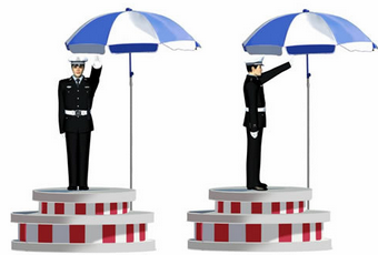 交警脸看左边车道且左手上下摆动-左转弯待转