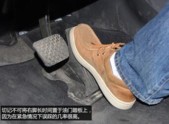 新司机开车时容易紧张,脚总是踩在油门上,当紧急情况发生时,是最容易发生错误的。所以一定要养成不踩油门时就将脚移到刹车上的习惯,当右脚放在刹车上时,绝大多数情况并不踩下去,只是处于“警戒”状态。一旦有情况,根本不需要做判断,只要踩下去就可。这样可以保证,右脚永远能够在第一时间、以最快的速度把刹车踩下。同时驾车者永远没有把油门当刹车踩的机会,从而也就绝不会发生把油门当刹车踩这样的错误。