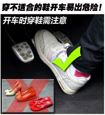 运动鞋和拖鞋、高跟鞋都是车祸的根源,建议大家不要穿这些鞋驾驶车辆。为什么呢?首先运动鞋一般都有气垫之类的缓冲设计,脚掌与鞋底难以贴合,在做半联动、点刹等动作时,力度无法掌握,很容易出事;而穿拖鞋最大的问题就是鞋与脚固定不牢固,不论是硬材质的凉拖和软材质的人字拖开车都很危险。