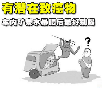 夏季车里放矿泉水 最好即开即喝。天气渐热,许多车主喜欢在车内存些瓶装矿泉水。可您知道吗,矿泉水瓶经暴晒或长时间存放在闷热高温的环境里,容易发生材质老化,并释放有毒物质,长期饮用对人体有害。团车网(100che.cn)在此提醒各位车主,车里别存放太多瓶装矿泉水了,最好即开即喝!