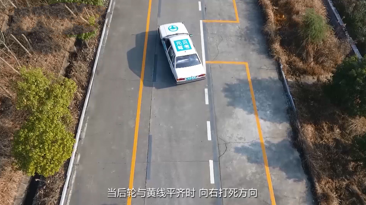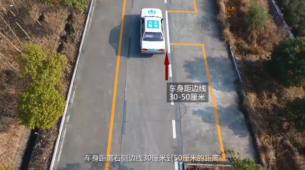 1、进入考试区域后,控制车身距离右侧黄线在30-50公分左右的距离。车头与库前第二个黄线对齐时停车。