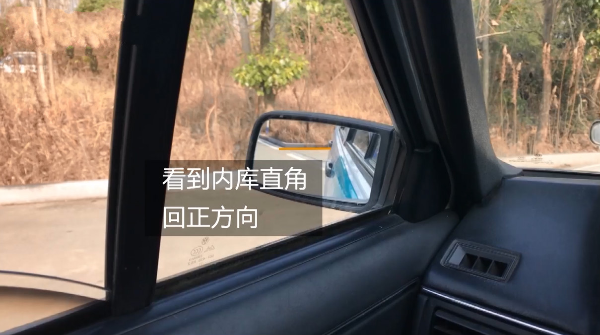 2、挂倒档开始倒车。观察右侧后视镜,当右后轮与库前黄线对齐时,立即向右打死方向。