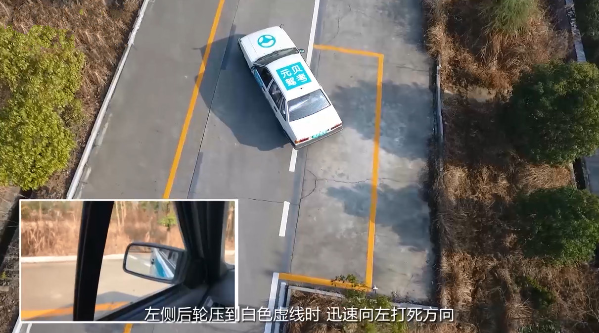 4、当左侧后轮压到库边白色虚线时,迅速向左打死方向。