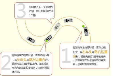 车到中间时,感觉车道变宽,将要对称车头边缘大小时,迅速回正方向,接近弯道又来一圈方向,加以微调,使圆点切着弯道走完,看到后轮全部出了弯道才能打方向。