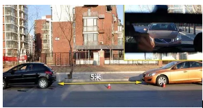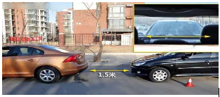 三厢车在前:对于三厢车来说,倾斜的后窗多少会影响视觉上的判断,虽然同样是挡风玻璃下沿重叠视线,但是考虑到视线和三厢车突出的尾部,此时辆车相距仅1.5米。