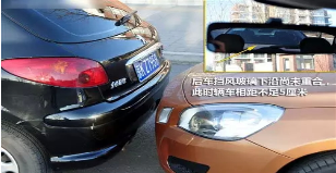 两厢车在前:两厢车后窗角度偏直角,可以使其出现在后视镜中的视野有所提升。并且车窗面积相对于车身比例较大,因此观察后视镜当后车轮已经被盖住时,两车距离只有5米左右。