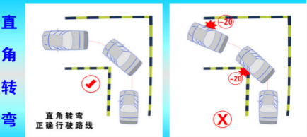 多数地区是将右向直角转弯作为考试标准(左向直角转弯基本相同)。当我们驾驶考试车进入直角转弯区后,要使车辆右侧与路边线保持在30公分的距离左右(此距离的把控很重要,如果距离小于30公分,容易使车右侧轧线;如果大于30公分,左侧触线的概率就会大大增加)直线前进,保持正确的驾驶姿势,当我们观察到车辆引擎盖最前沿与边线重合时,迅速将方向盘向左打到底,等到车身完全转正,迅速回正方向,直角转弯结束。