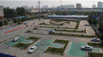 以岑村车管所考场为例,直角转弯结束后,考生需驾车通过一个下坡,右转至倒车入库考场。倒车入库为“T”字形。