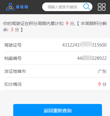 发证地省市,驾驶证号,档案编号这三个信息是必填的,缺一个或者输入错误都不能查到驾驶证扣分信息。