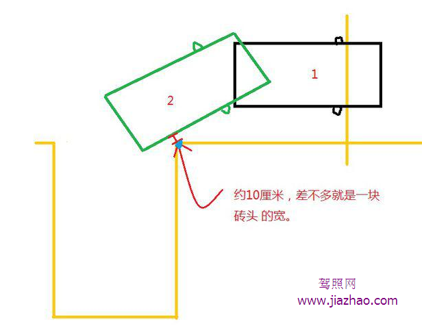 第一个点,是倒库时向左/右打死方向盘的点,特征是左后视镜下沿边线与起点线(虚线)重合。