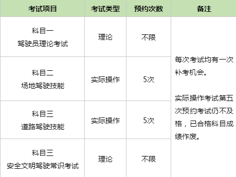 许多学员对驾考的每个科目可以补考几次表示有疑问,下面一张图能跟你说明。