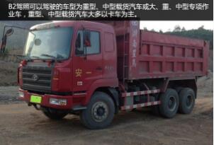 B2就是大型货车解释为可以驾驶重型、中型载货汽车;大、重、中型专项作业车,并包括小型汽车、小型自动挡汽车、低速载货汽车或者三轮汽车。