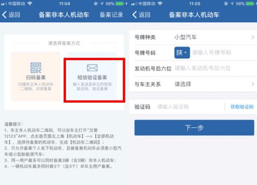 采用“短信验证备案”的,用户输入需要备案的非本人机动车的号牌种类、号牌号码、发动机号后六位等信息后,系统将发送短信验证码至车主手机号码(车主可以是非互联网平台注册用户),申请用户输入车主收到短信验证码。