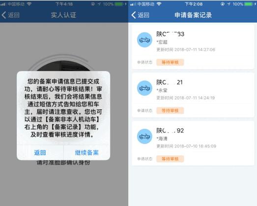 对于未启用公安部可信身份认证或 “实人认证”未通过的,提示用户采集上传 “用户手持身份证或驾驶证照片”。网办中心工作人员将在一个工作日内对备案信息审核确认,审核通过后,系统会将审核结果通过短信或“交管12123”APP消息发送给备案用户和车主。