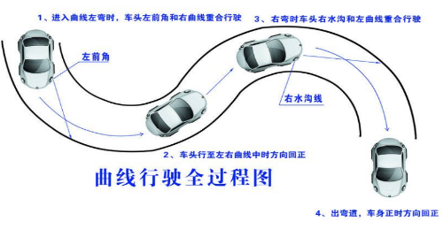 这个我们以左入口为例来讲,首先是在进入左弯时,车身靠右行驶,待左车头盖搭上右边线上时,向左打方向盘。通过弯道时,跟随着外弯道的线行驶。如左转的时候,让左车头盖保持沿着右边线行驶。紧接着接近中间路段,让车头慢慢向左摆直,直至这个左车头盖搭上左线时,方向回正。
