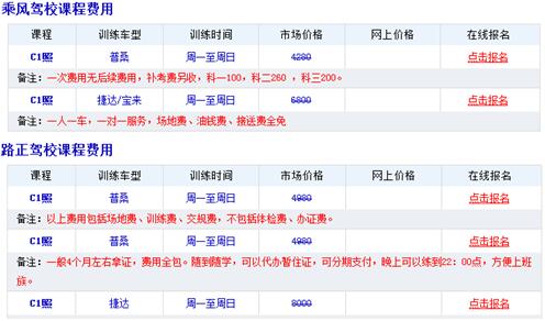 费用是学员在选择驾校时候首要考虑的问题,不同驾校有不同的标准,有的甚至相差很多,下面给大家看几个驾校的价格情况,以便大家了解行情。