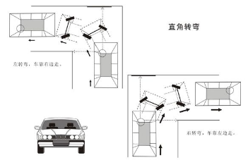 直角转弯技巧一:车身右侧靠近外直角边线前进,左、右前车门三角窗中间对准内、外直角线时方向向左、右打到底,车正时回正。