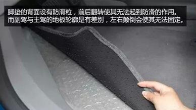 有部分款式的脚垫正反面十分相似,车主要仔细辨认清楚。脚垫的正反面颠倒不但不能起到防尘防滑的作用,而且还无法牢固固定,甚至还会与踏板发生干涉。前后颠倒铺设也都是禁止的。